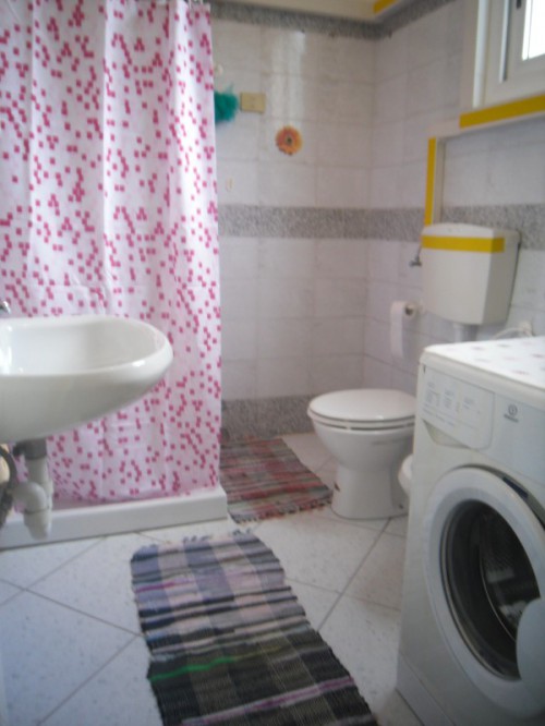 il bagno con doccia e lavatrice,una zona notte con un letto a castello.
